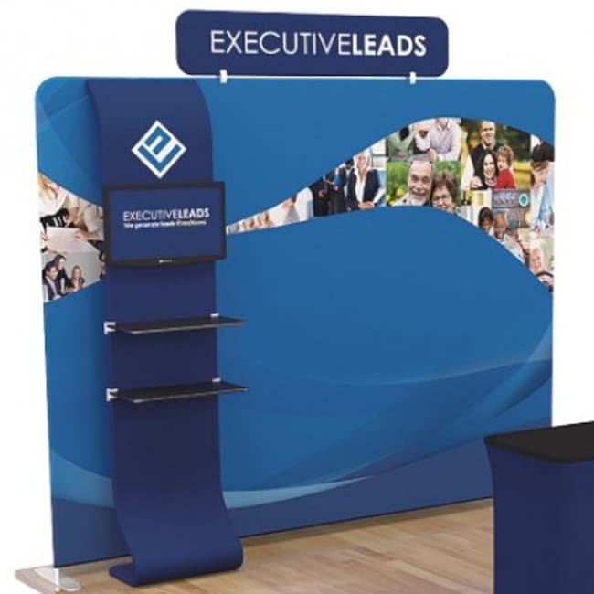 10FT FLAT TENSION FABRIC DISPLAY WITH HEADER AND SHELVING